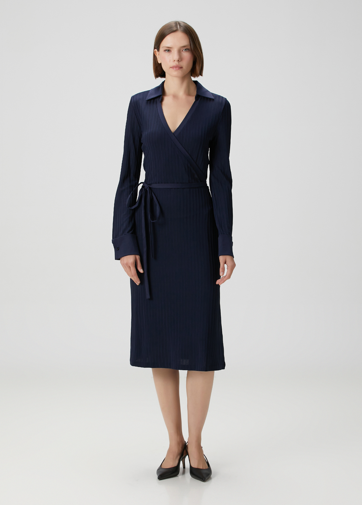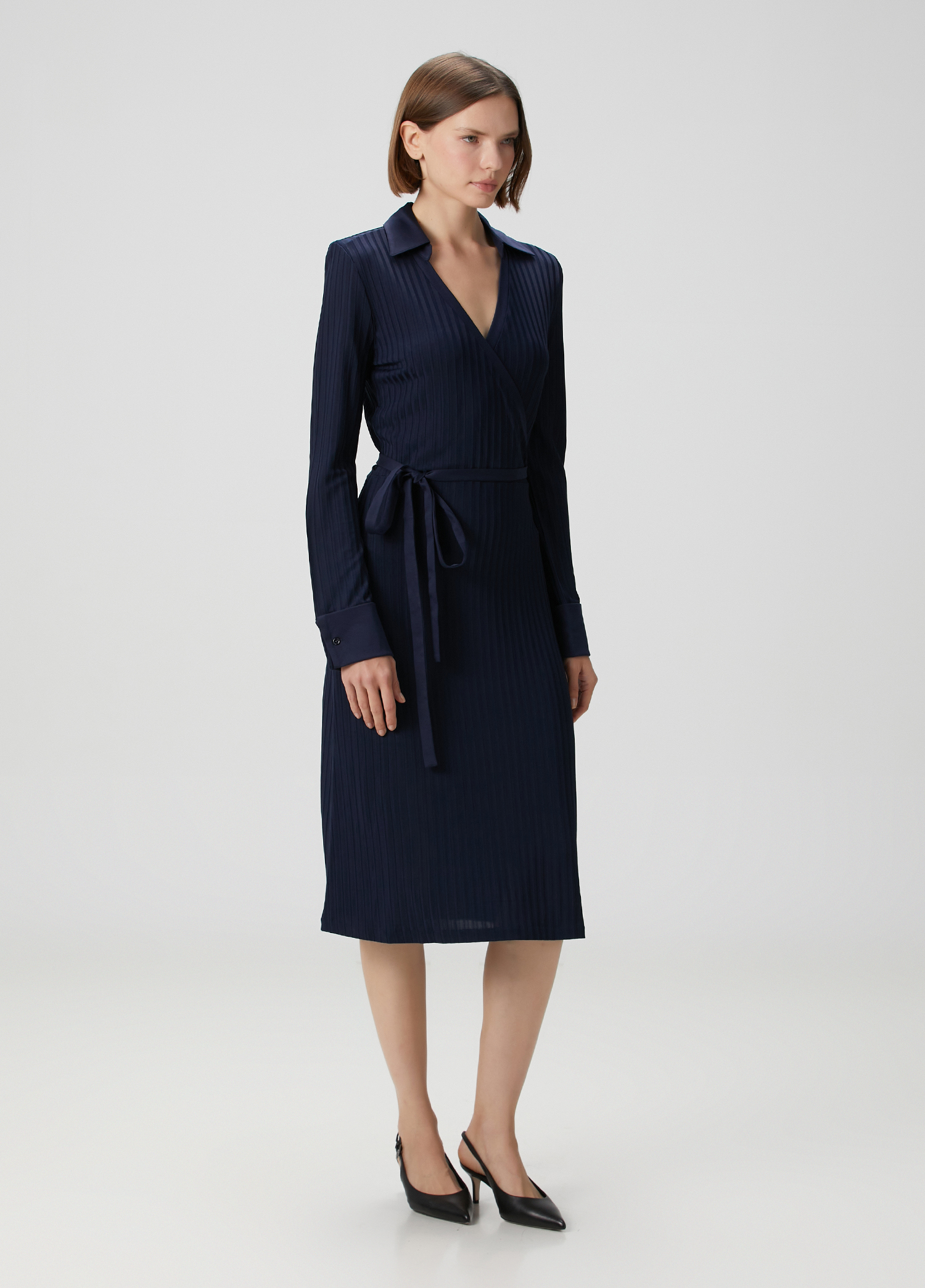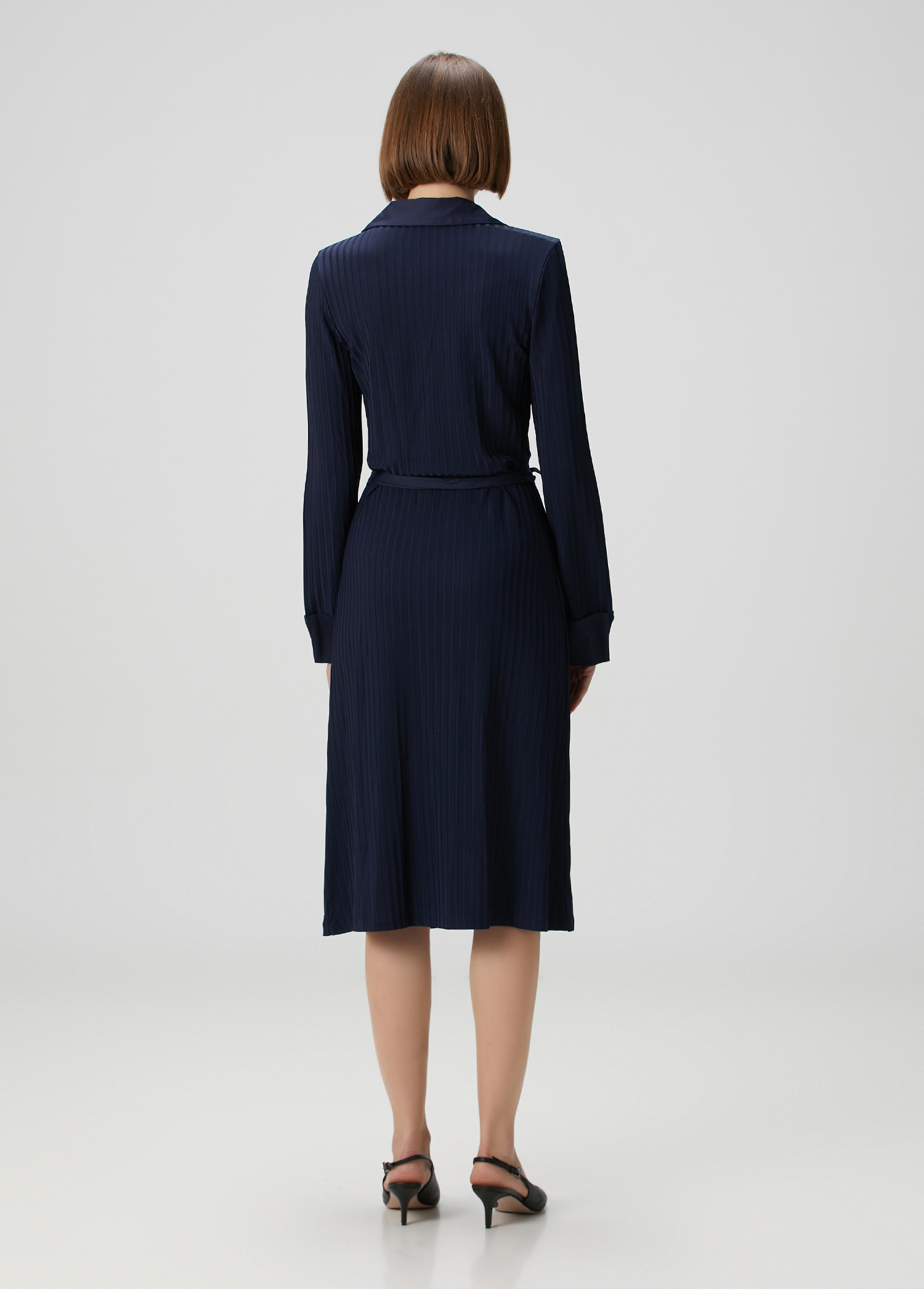 ویژگیهای محصول: لباس یقه هفت، آستین بلند، قد متوسط. راه راه، با کمربند. سایز محصول: M / ابعاد مدل: قد: ۱۷۵ سانتیمتر – دور سینه: ۸۰ سانتیمتر – دور کمر: ۵۸ سانتیمتر – دور باسن: ۸۹ سانتیمتر.