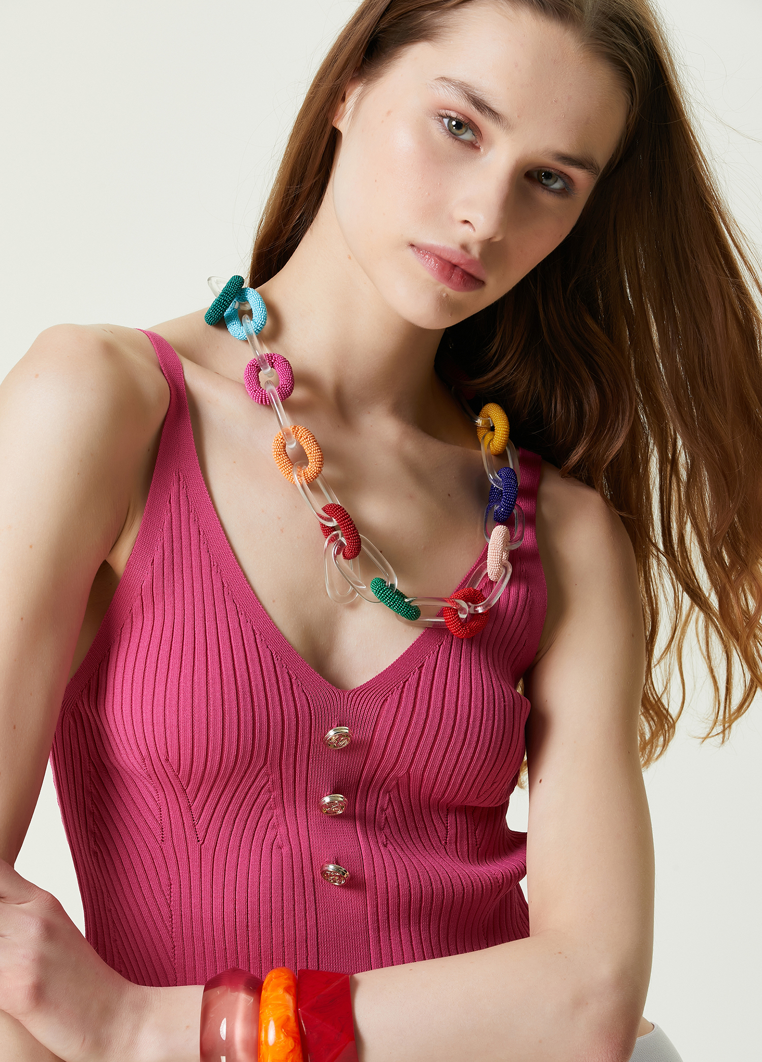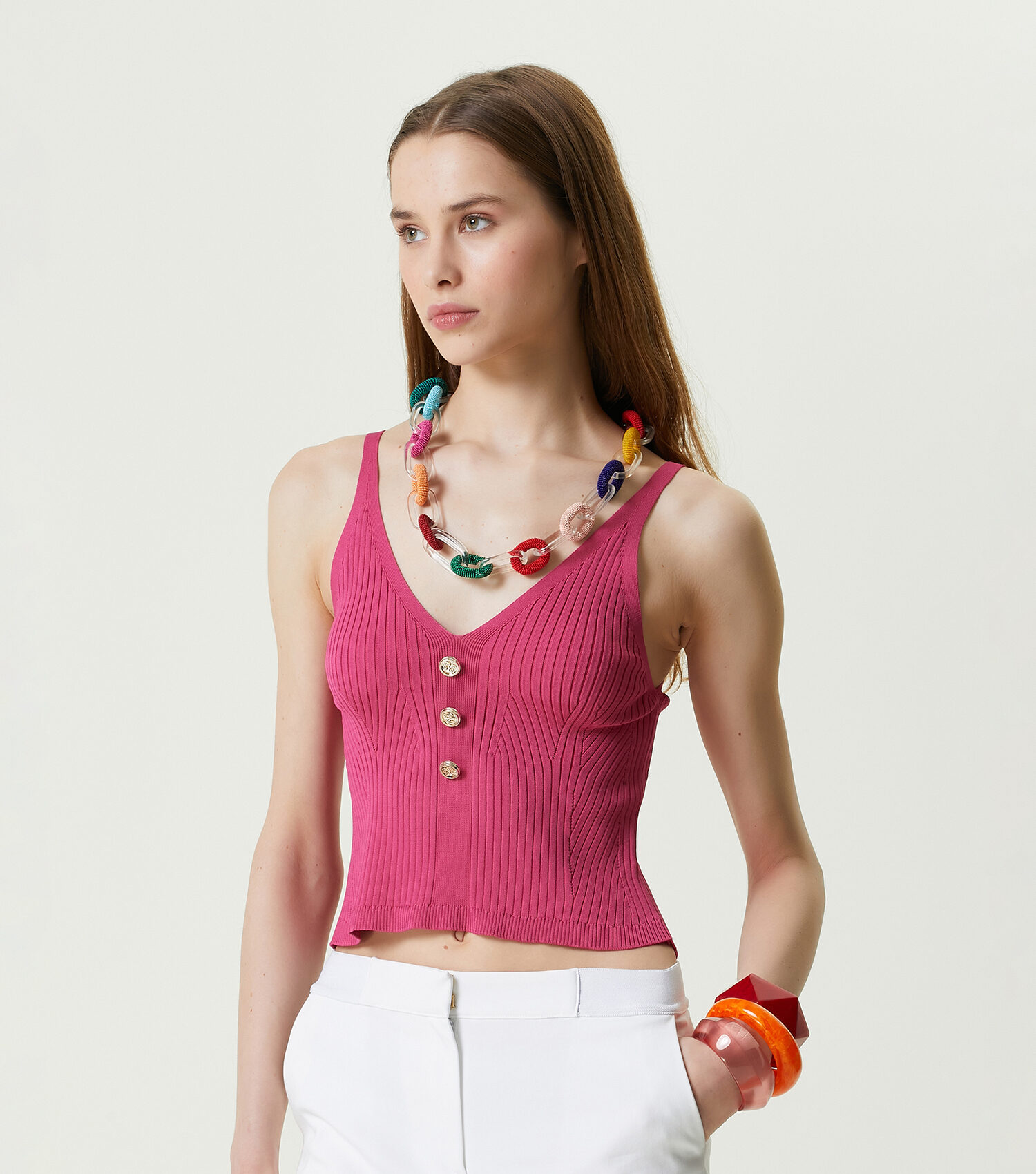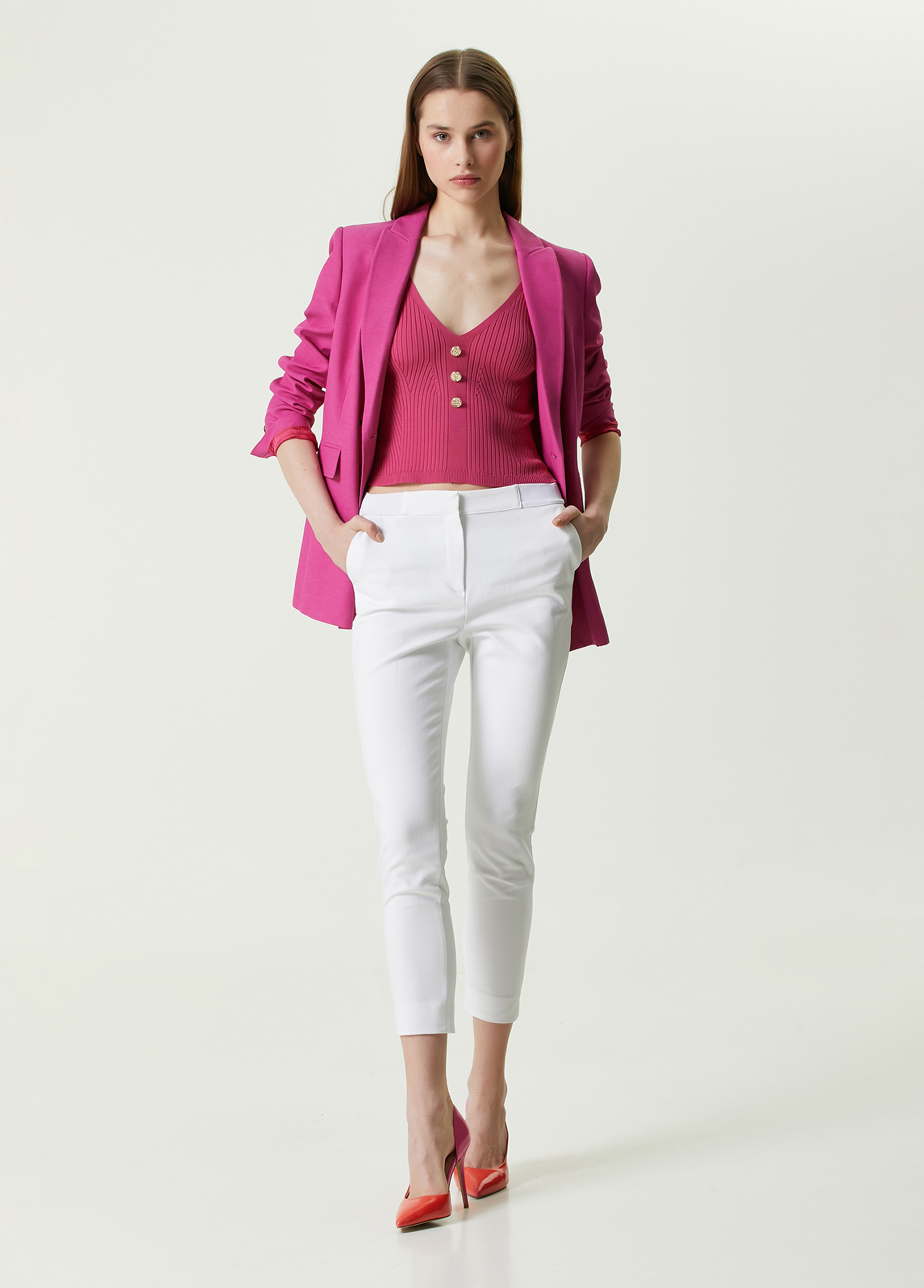 ویژگی‌های محصول: پلیور بافتنی بدون آستین یقه هفت اسلیم فیت با دکمه‌های ریز. سایز محصول: سایز S / ابعاد مدل: قد: ۱۸۱ سانتی‌متر – دور سینه: ۸۳ سانتی‌متر – دور کمر: ۶۰ سانتی‌متر – دور باسن: ۸۹ سانتی‌متر.