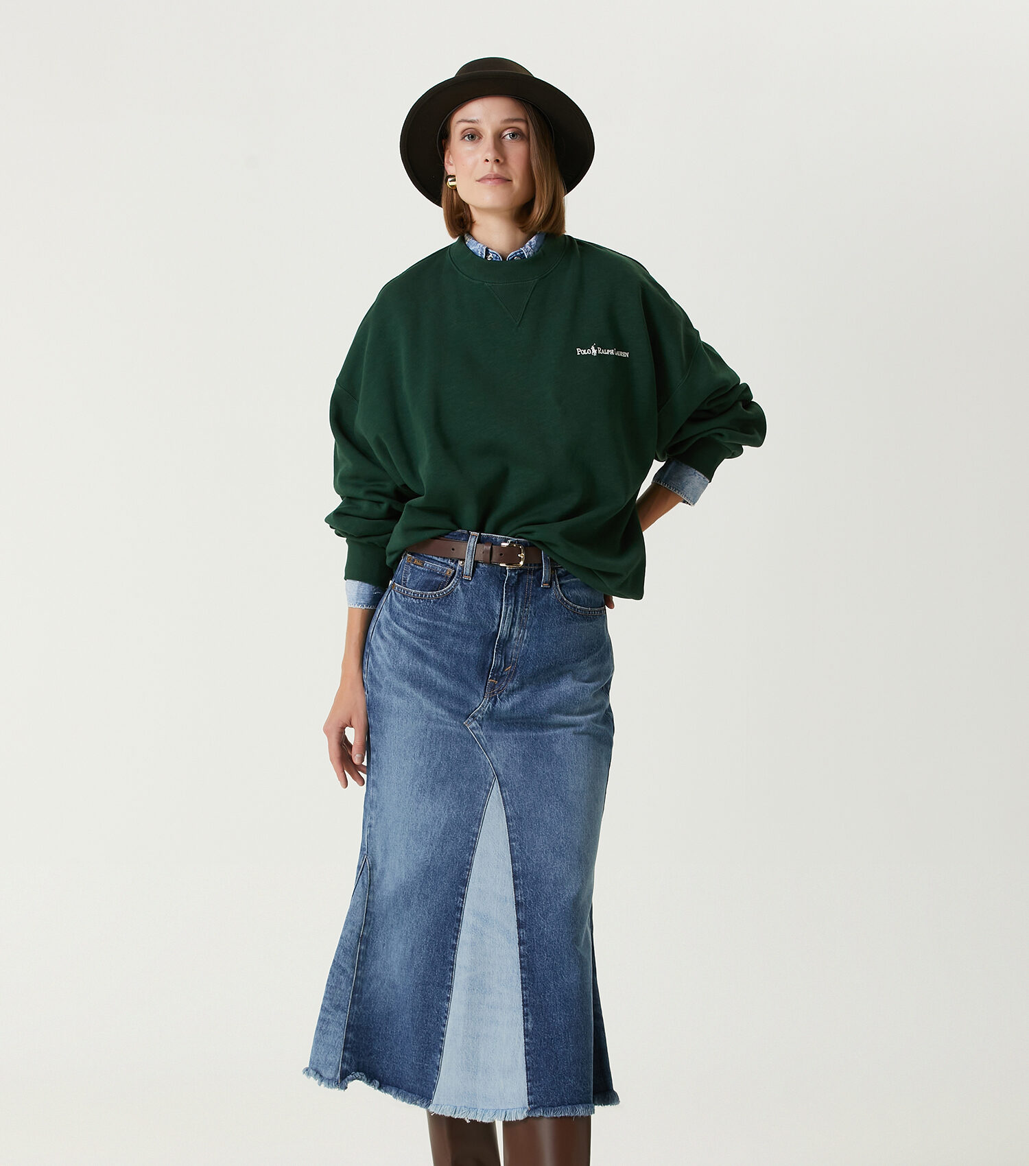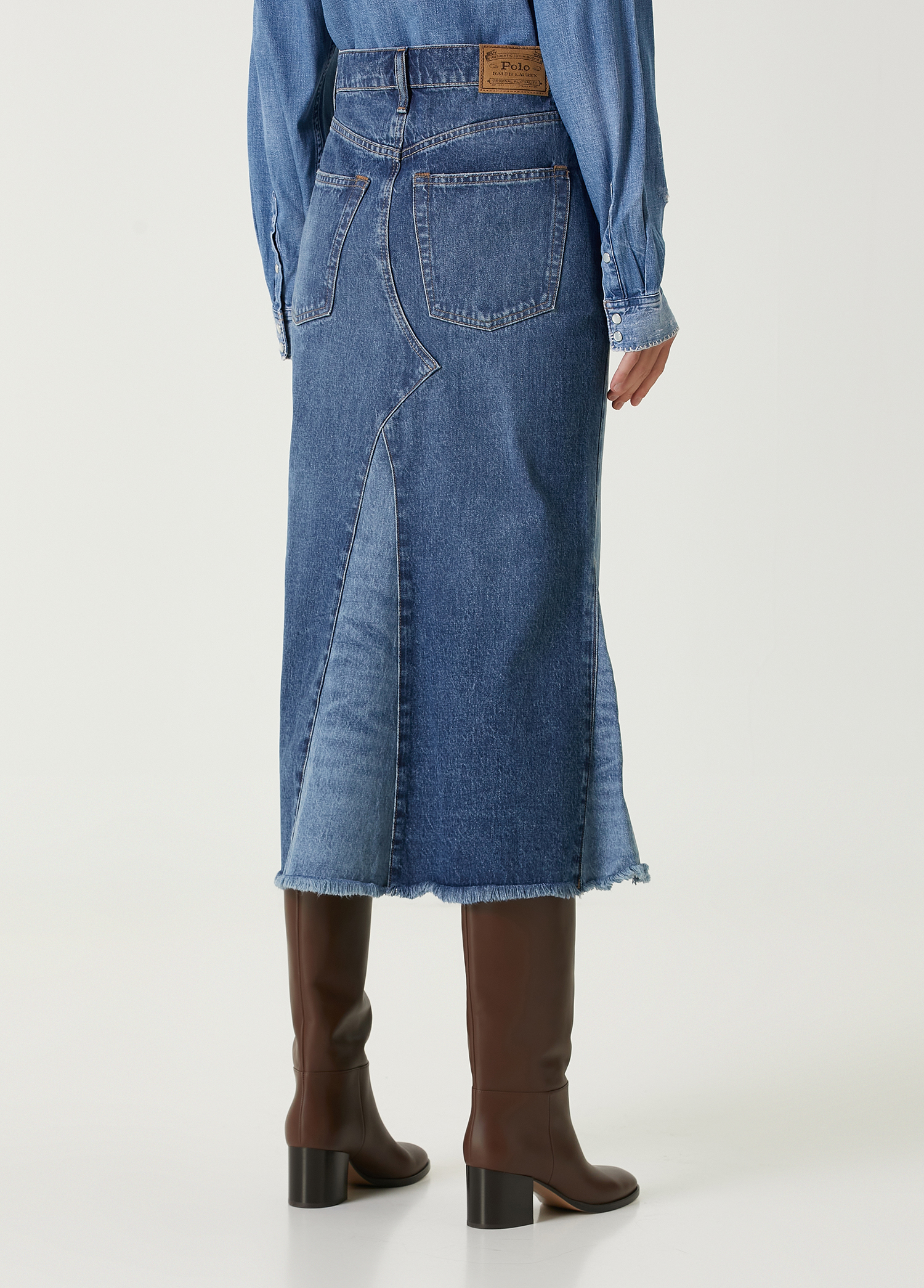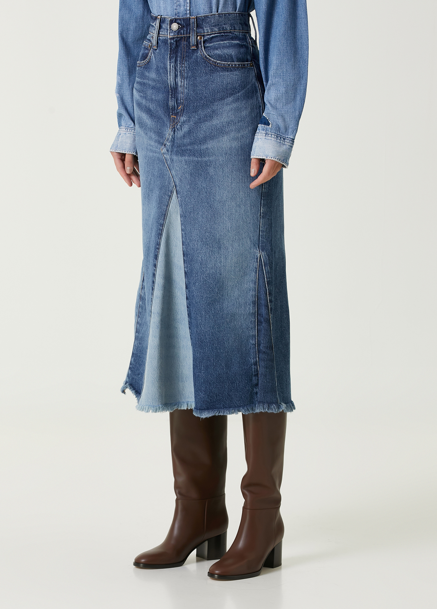ویژگیهای محصول: دامن جین چهل تکه، بلند، با کمر بلند، با زیپ، حاشیهدار و ۵ جیب. سایز محصول: ۲۶ / ابعاد مدل: قد: ۱۸۰ سانتیمتر – دور سینه: ۸۰ سانتیمتر – دور کمر: ۶۱ سانتیمتر – دور باسن: ۹۰ سانتیمتر.